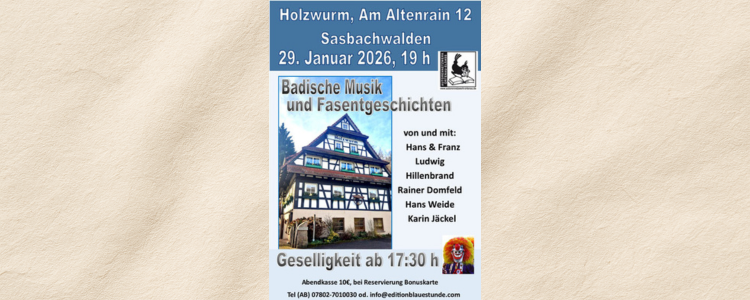 Wer es gesellig, mundart-lich und fasentlich mag, ist am 29. Januar im idylli-schen Holzwurm in Sasbachwalden richtig.